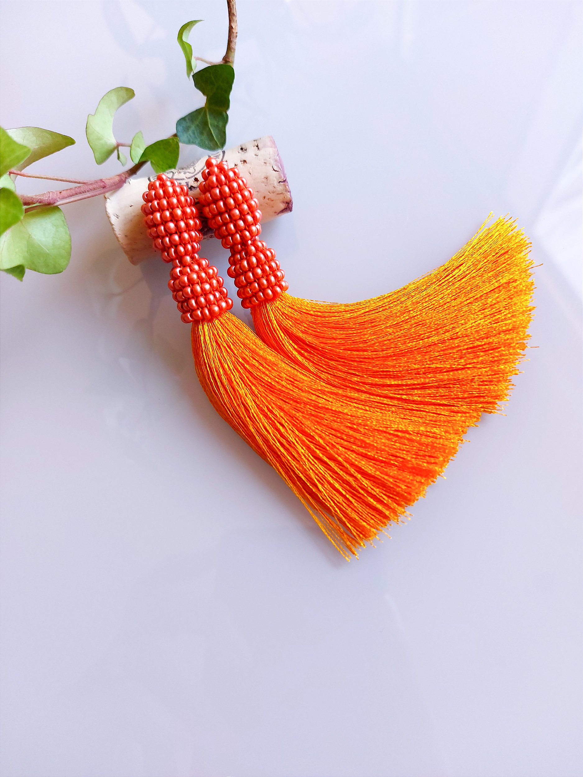 Brinco Franjas feito em miçangas de Vidro e tassel de trilobal. As franjas possuem brilho característico de seda e o brinco é bem leve e confortável. A peça possui acabamento de primeira.